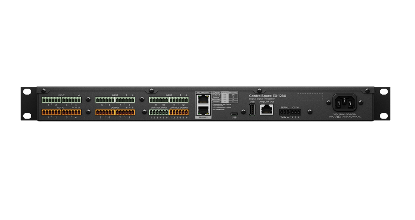 ControlSpace EX-1280 是一款 1 RU 的功能強大的數字信號處理器,采用開放式架構,適用于通用音頻處理應用。十二個麥克風/線路模擬輸入、八個模擬輸出、一個 Bose AmpLink 輸出和 64 x 64 Dante? 連接可實現靈活配置和高品質音響系統控制。ControlSpace Designer 軟件通過拖放式編程簡化了設置過程,使配置變得快速而簡單。