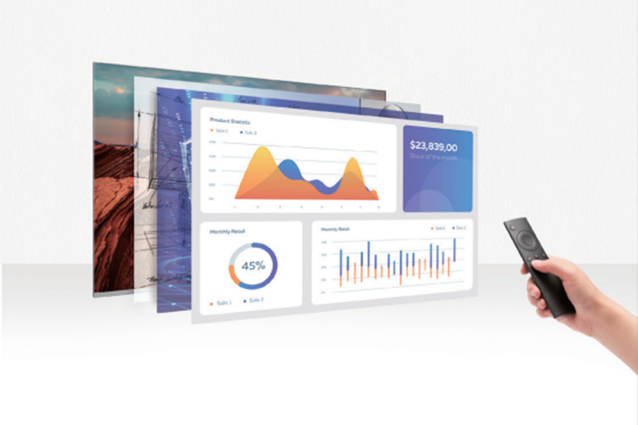 ④ 遙控控制,無線極速投屏:像操控一臺大電視一樣簡單易用,可通過遙控器實現(xiàn)開關機、亮度/色溫調節(jié),內容切換,上下翻頁等功能。支持電腦、手機、平板等設備投屏,多種設備同時在線操作,分享不受“線”制。