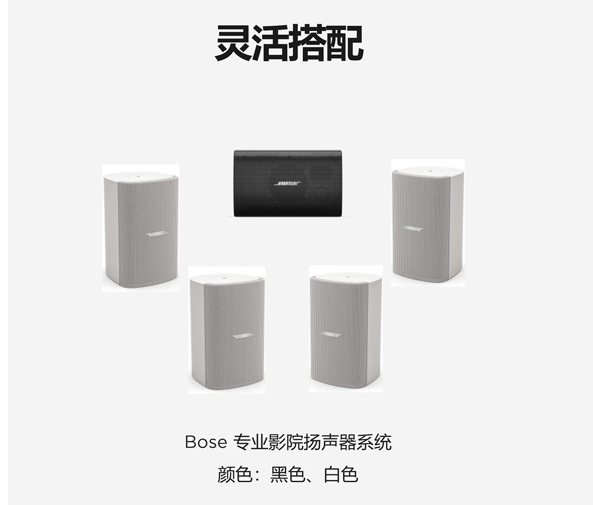 Bose專業家庭影院揚聲器系統,采用全音域單元設計,層次感清晰、人聲飽滿不失真,可以聽到每種樂器和人聲的細微差別,高度還原影院現場感;揚聲器黑、白兩色自由搭配,與房間設計更加融合,將現代美學和實用功能相結合;同時搭配支持Dolby Atmos的家庭影院功放,即可實現7.1/5.1觀影需求,以及通過功放選擇2.1聲道,實現立體聲音效,帶來影院般震撼視聽體驗。